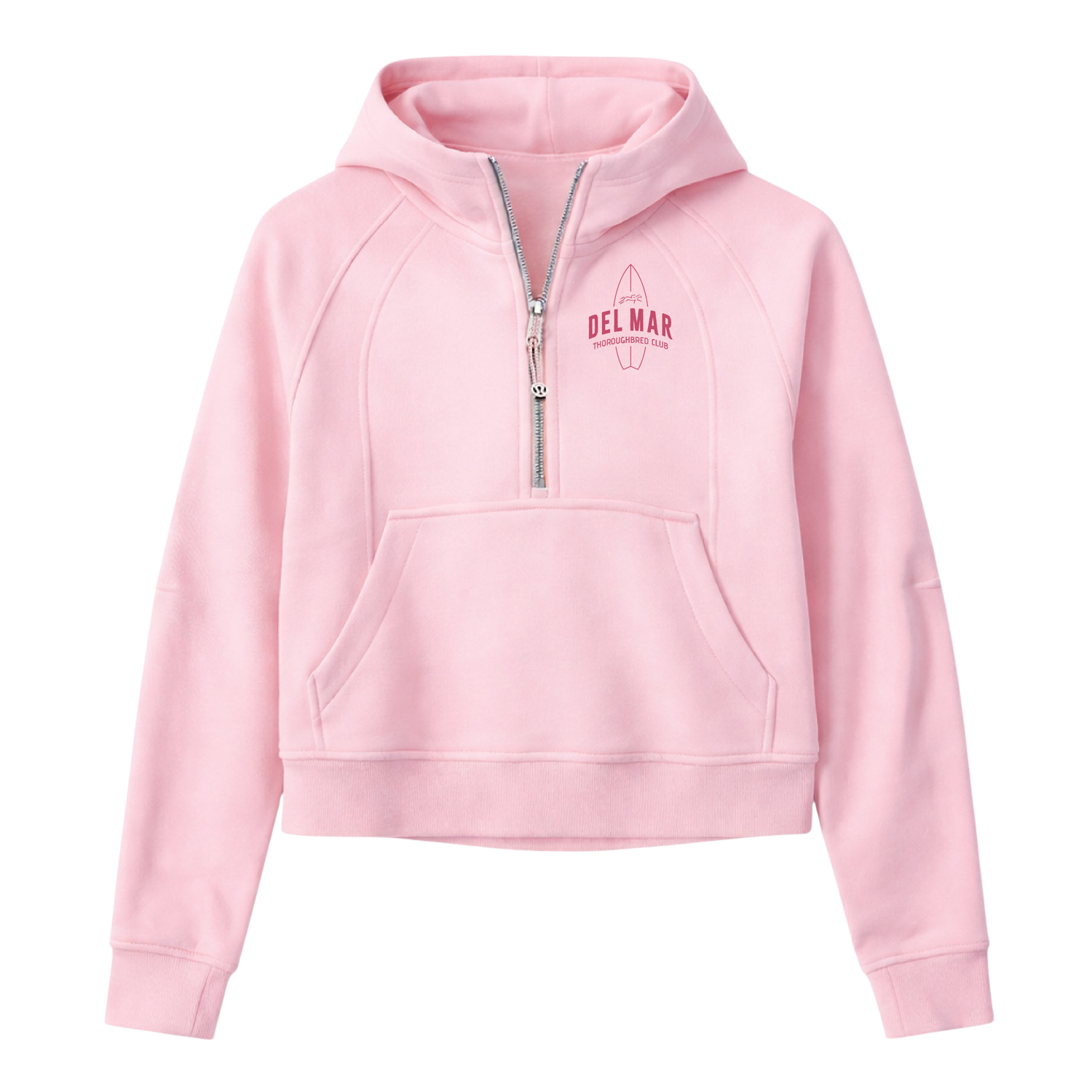 Stay cozy with this limited-edition Lululemon Scuba Half-Zip Hoodie. Designed with lululemon’s signature soft, heavyweight fleece, it delivers warmth without sacrificing style. The standout detail is a custom Del Mar Racetrack logo reimagined with a laid-back surfboard motif. Featuring an oversized fit, kangaroo pocket, and half-zip neckline, it’s the perfect layer for cool mornings, post-workout comfort, or sunset strolls by the water.